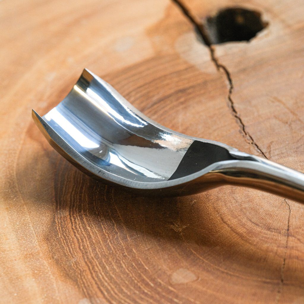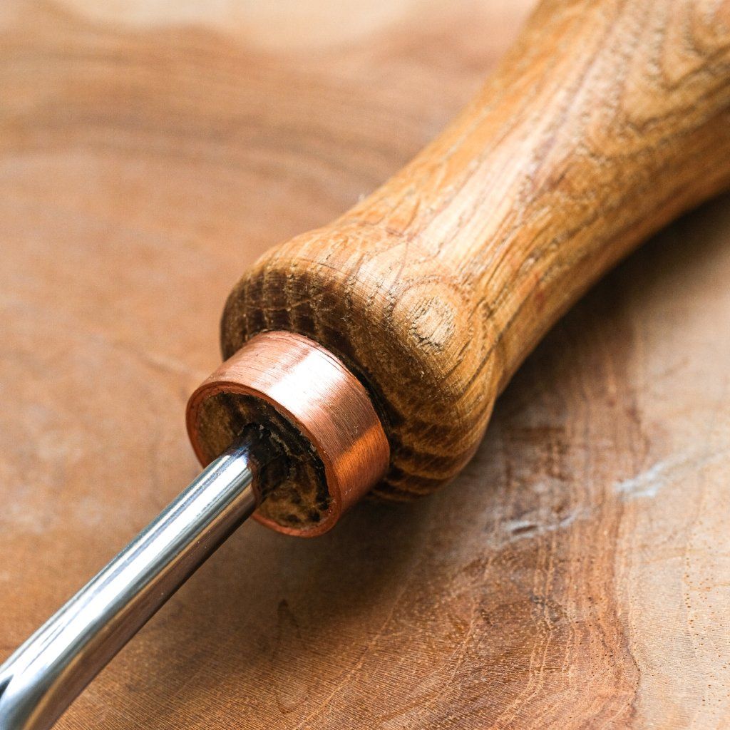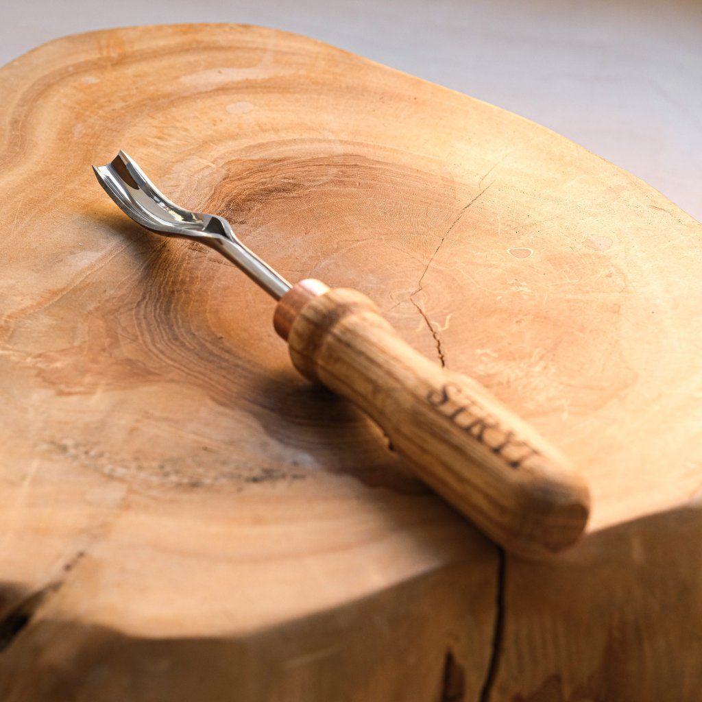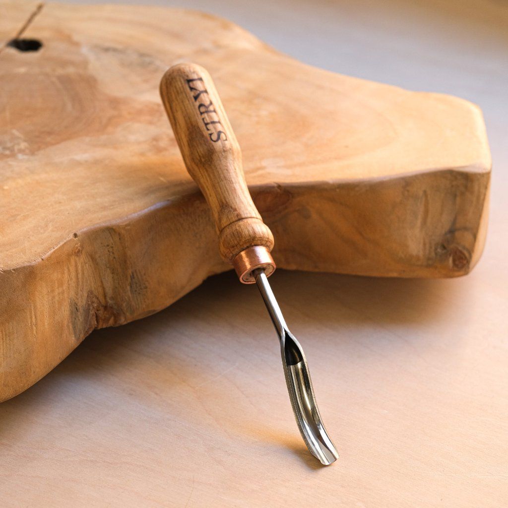 A curved semi-circular chisel of medium size, ideal for hard-to-reach places and for working without the handle touching the surface of the product. The tool is made of quality carbon steel and oak wood treated with linseed oil. The chisel profile is ideal especially for making wooden spoons, ladles, cups, or bowls. Suitable for both beginners and professionals. Useful for working with both soft and hard wood. The tool comes in a cardboard box, sharpened, and ready for use.