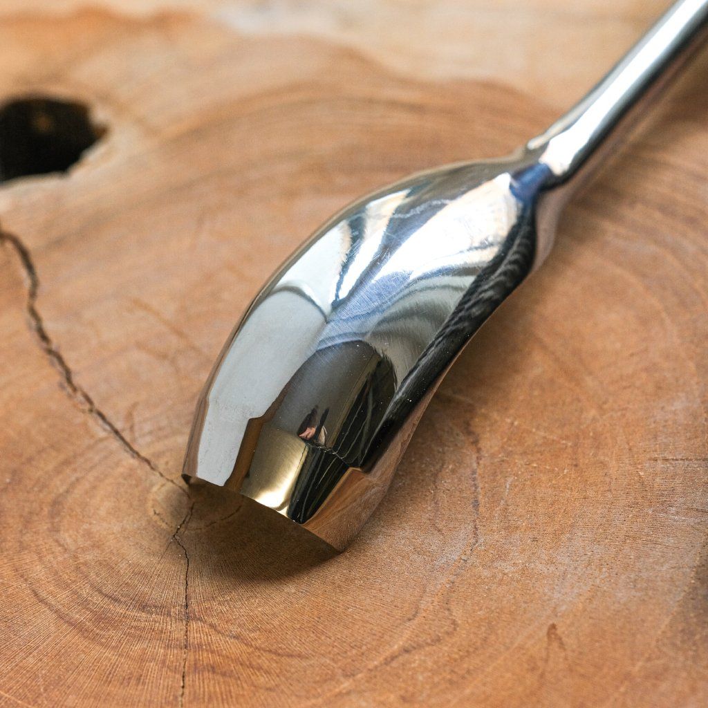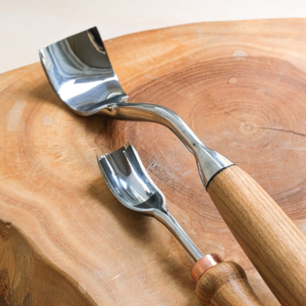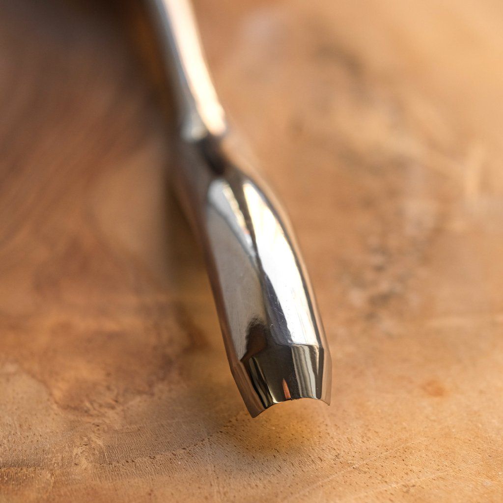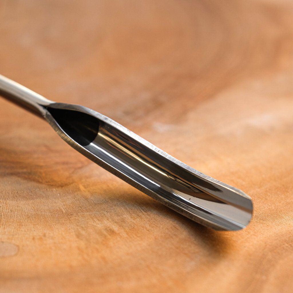A curved semi-circular chisel of medium size, ideal for hard-to-reach places and for working without the handle touching the surface of the product. The tool is made of quality carbon steel and oak wood treated with linseed oil. The chisel profile is ideal especially for making wooden spoons, ladles, cups, or bowls. Suitable for both beginners and professionals. Useful for working with both soft and hard wood. The tool comes in a cardboard box, sharpened, and ready for use.