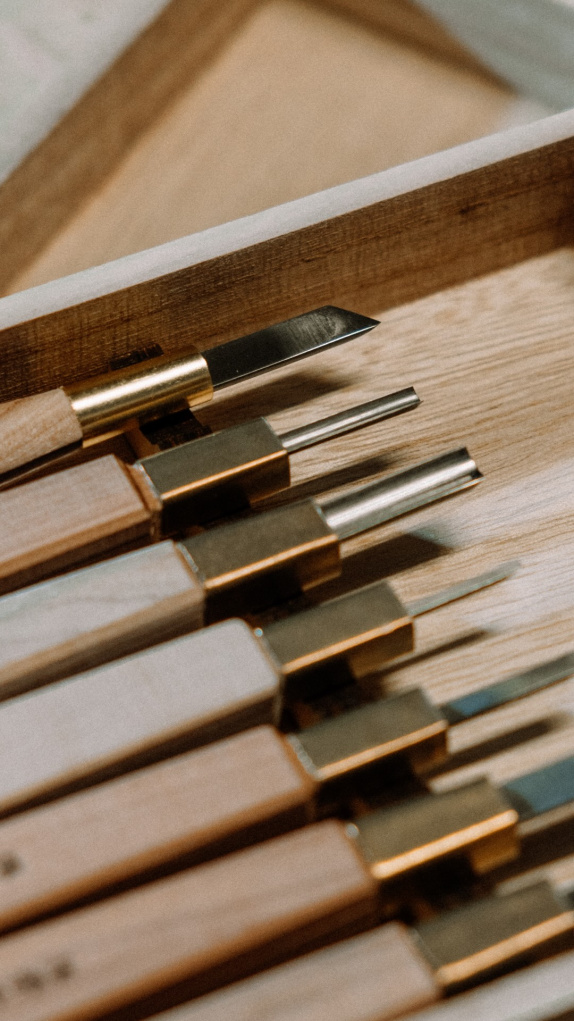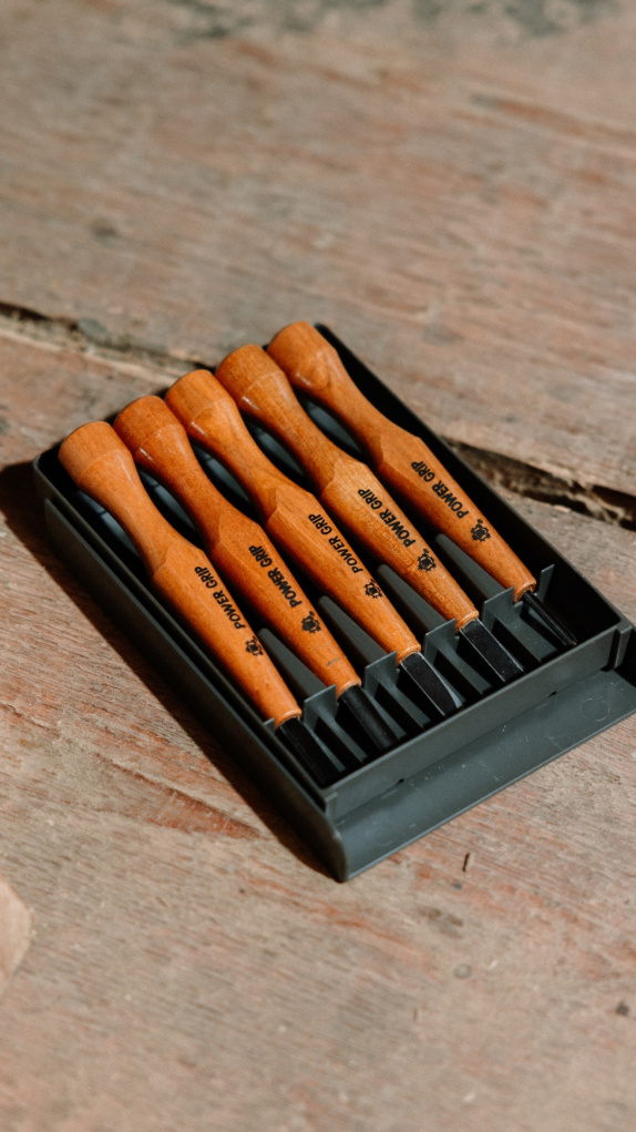 Set sedmi řezbářských dlát od japonské firmy Michihamono s rukojeťmi z třešňového dřeva a čepelemi z rychlořezné oceli....