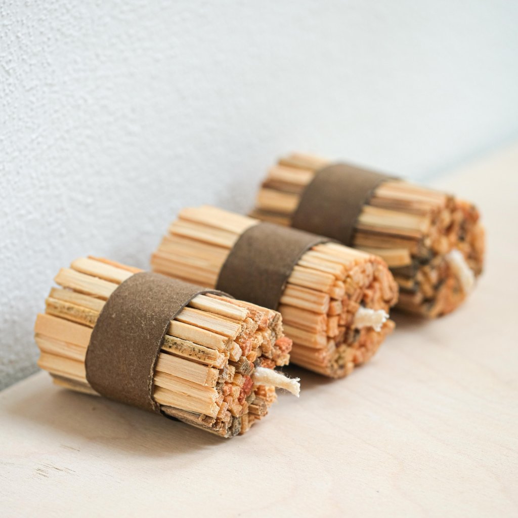 Podpalovač je vyroben ze 100% přírodních a recyklovaných materiálů: dřevěných odřezků, roliček od toaletního papíru a vosku z použitých svíček.