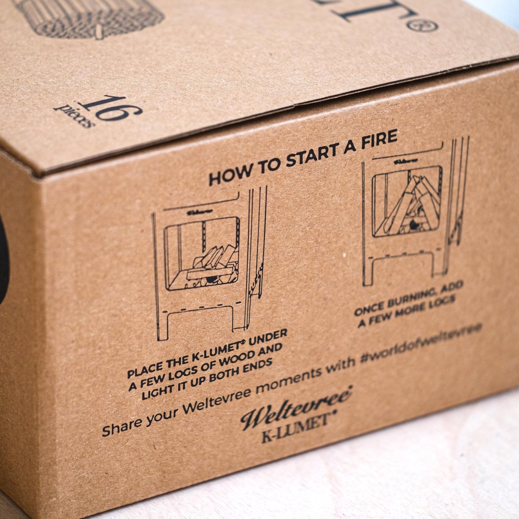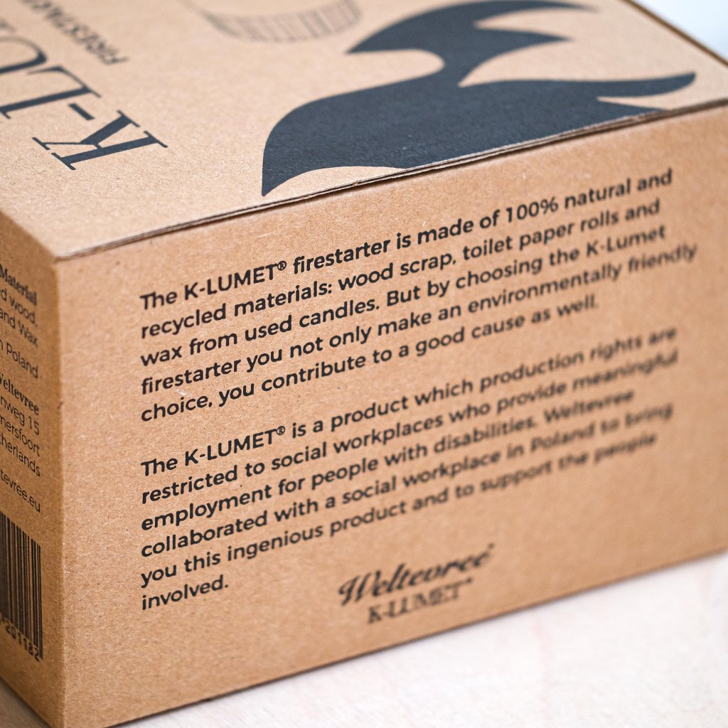 Poznámka: Podpalovač K-Lumet je produkt, jehož výrobní práva jsou omezena na sociální pracoviště, která poskytují smysluplné zaměstnání osobám se zdravotním postižením. Společnost Weltevree spolupracovala se sociálním pracovištěm v Polsku, aby mohla přinést tento důmyslný výrobek a podpořit lidi, kteří se na něm podílejí.