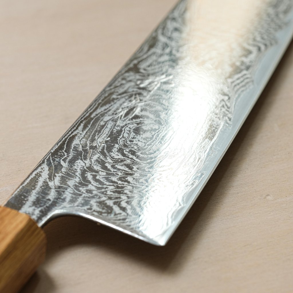 Japonský kuchyňský nůž ručně kovaný ve městě Sakai. Všestranný model Gyuto s povrchovou úpravou Kurouchi a dubovou rukojetí.