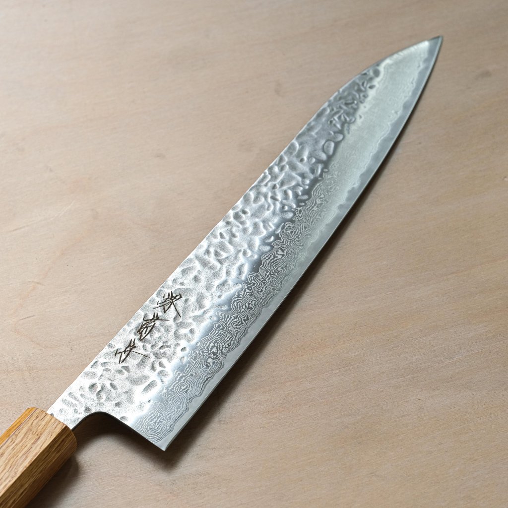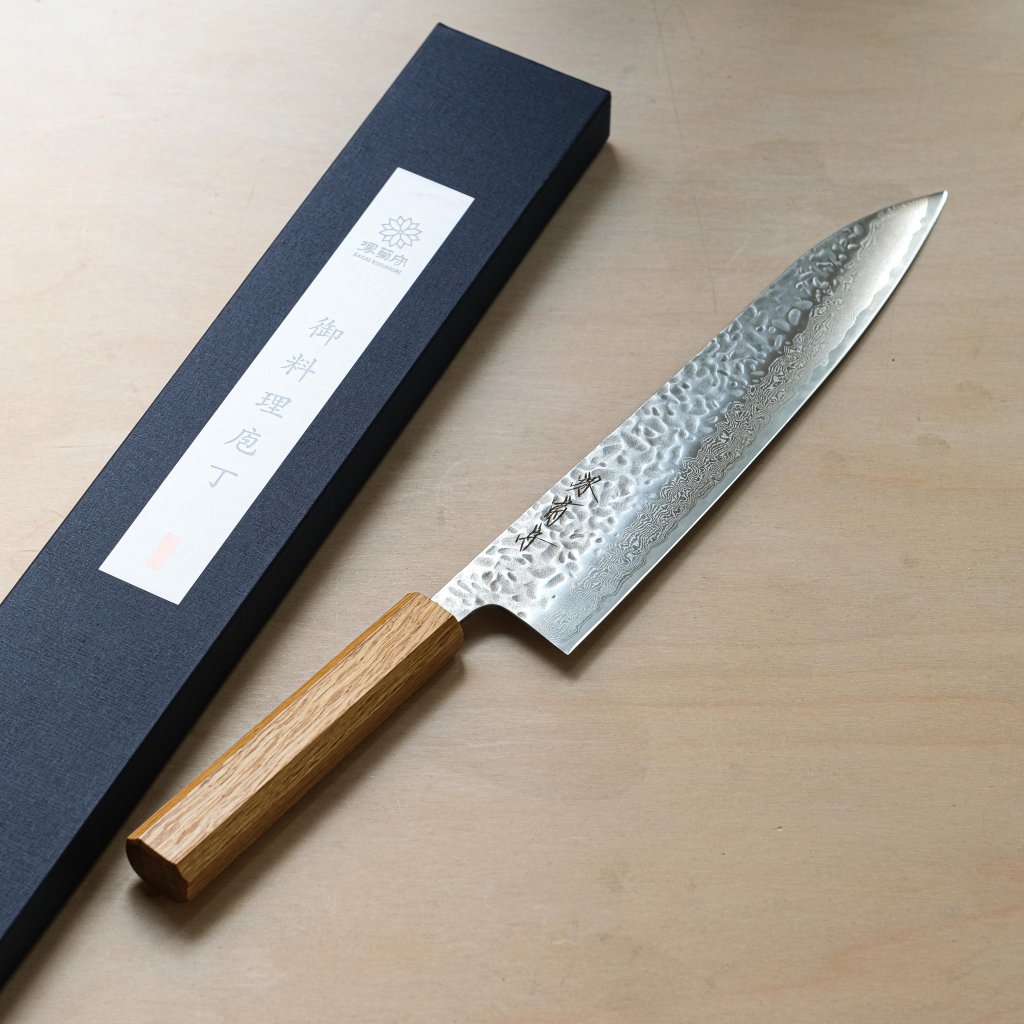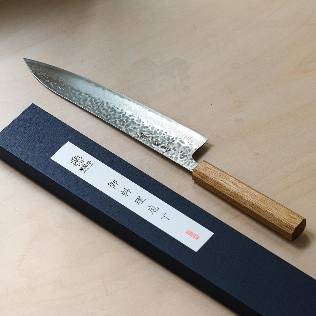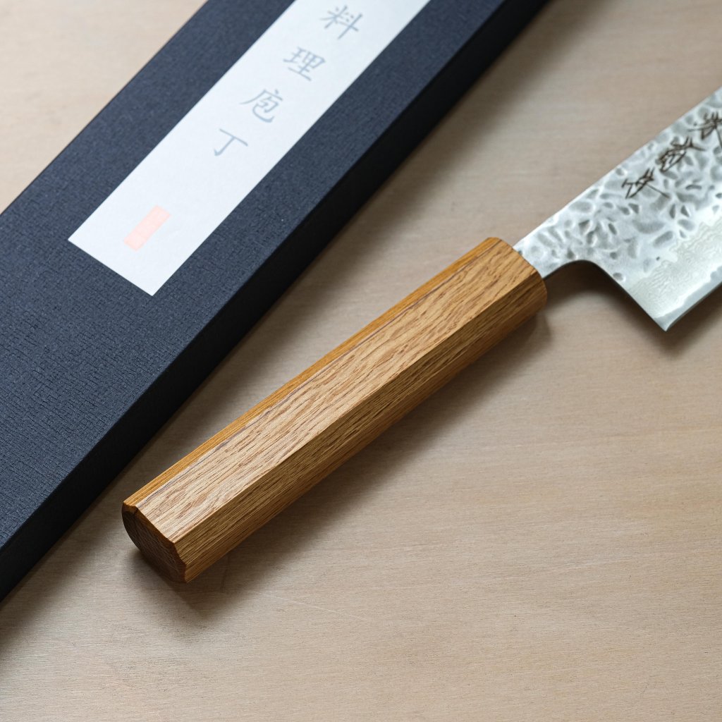 Japonský kuchyňský nůž ručně kovaný ve městě Sakai. Všestranný model Gyuto s povrchovou úpravou Kurouchi a dubovou rukojetí.
