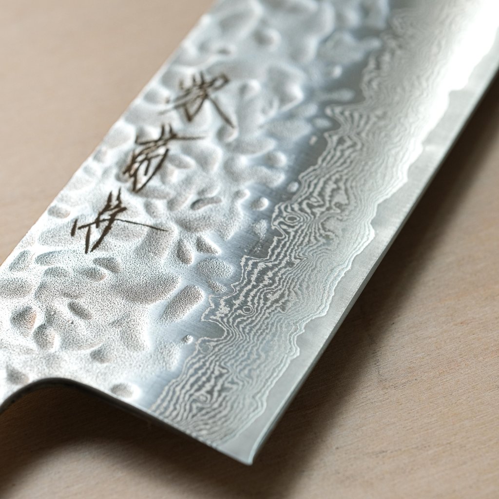 Jádro čepele je z japonské nerezové oceli AUS-10 se zvýšeným obsahem uhlíku. Značné množství tohoto prvku zaručuje snadné broušení a tvrdost 58-60 HRC. AUS-10 má skvělou retenci ostří, houževnatost, odolnost proti korozi a opotřebení. Nože z této oceli se velmi dobře brousí a dosahují vynikajícího ostří. Jádro je opláštěno damaškovou úpravou, tedy několika vrstvami různých typů oceli, které vytvářejí vizuálně působivý vzor. Čepel má také povrchovou úpravu Tsuchime, která je ručně tepána za použití raznic.
