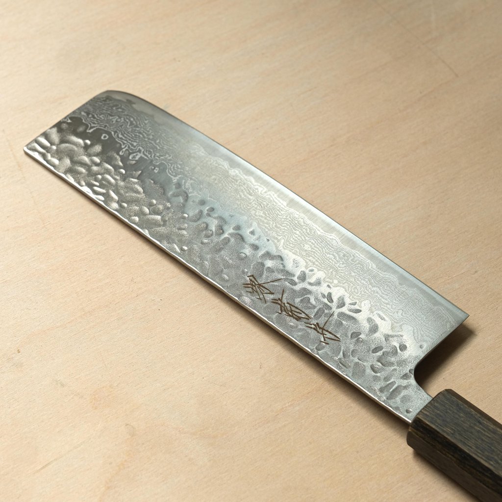 Japonský nůž Nakiri NAMI od Sakai Kikumori je ručně kovaný ve městě Sakai. Tento kuchyňský nástroj vyniká úžasnou ostrostí, která je kultivována těmi nejlepšími řemeslníky v průběhu celého výrobního procesu, od kování až po broušení. Nakiri je nůž specializovaný na krájení ovoce a zeleniny, ideální pro čisté, rovnoměrné řezy. Široká čepel snadno proniká i hustou zeleninou a zároveň slouží jako lopatka pro přenášení nakrájených surovin. Má charakteristický obdélníkový tvar s rovným ostřím a plochým profilem, ideální pro ty, kteří k vaření přistupují pečlivě a přesně. Model NDH má čepel z nerezové oceli AUS-10 s damaškovým opláštěním. Damašková kresba spolu s ručně tepanou úpravou Tsuchime dodávají noži nezaměnitelný vzhled.