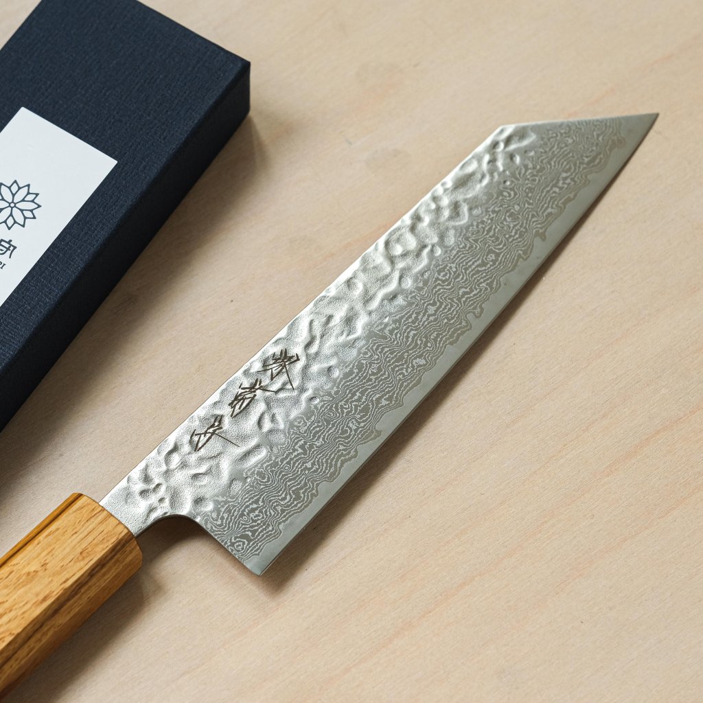 Japonský nůž Kiritsuke Santoku NDH od Sakai Kikumori je kvalitní kuchyňský nástroj, ručně kovaný ve městě Sakai. Nabízí úžasnou ostrost, která je kultivována těmi nejlepšími řemeslníky, od kování až po broušení. Kiritsuke Santoku je kombinací dvou tradičních japonských nožů, která spojuje to nejlepší z obou – technickou přesnost Kiritsuke s univerzálností a pohodlím Santoku. Má velmi ostrou špičku ve tvaru reverse tanto, která umožňuje provádět precizní řezy, například při vykrajování ovoce a zeleniny, filetování masa nebo krájení česneku a bylinek. Oproti běžnému Santoku vyžaduje o trochu víc zručnosti. Model NDH má čepel z nerezové oceli AUS-10 s damaškovým opláštěním. Damašková kresba spolu s ručně tepanou úpravou Tsuchime dodávají noži nezaměnitelný vzhled.