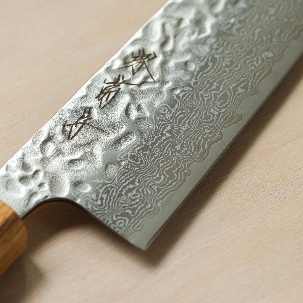 Jádro čepele je z japonské nerezové oceli AUS-10 se zvýšeným obsahem uhlíku. Značné množství tohoto prvku zaručuje snadné broušení a tvrdost 58-60 HRC. AUS-10 má skvělou retenci ostří, houževnatost, odolnost proti korozi a opotřebení. Nože z této oceli se velmi dobře brousí a dosahují vynikajícího ostří. Jádro je opláštěno damaškovou úpravou, tedy několika vrstvami různých typů oceli, které vytvářejí vizuálně působivý vzor. Čepel má také povrchovou úpravu Tsuchime, která je ručně tepána za použití raznic.