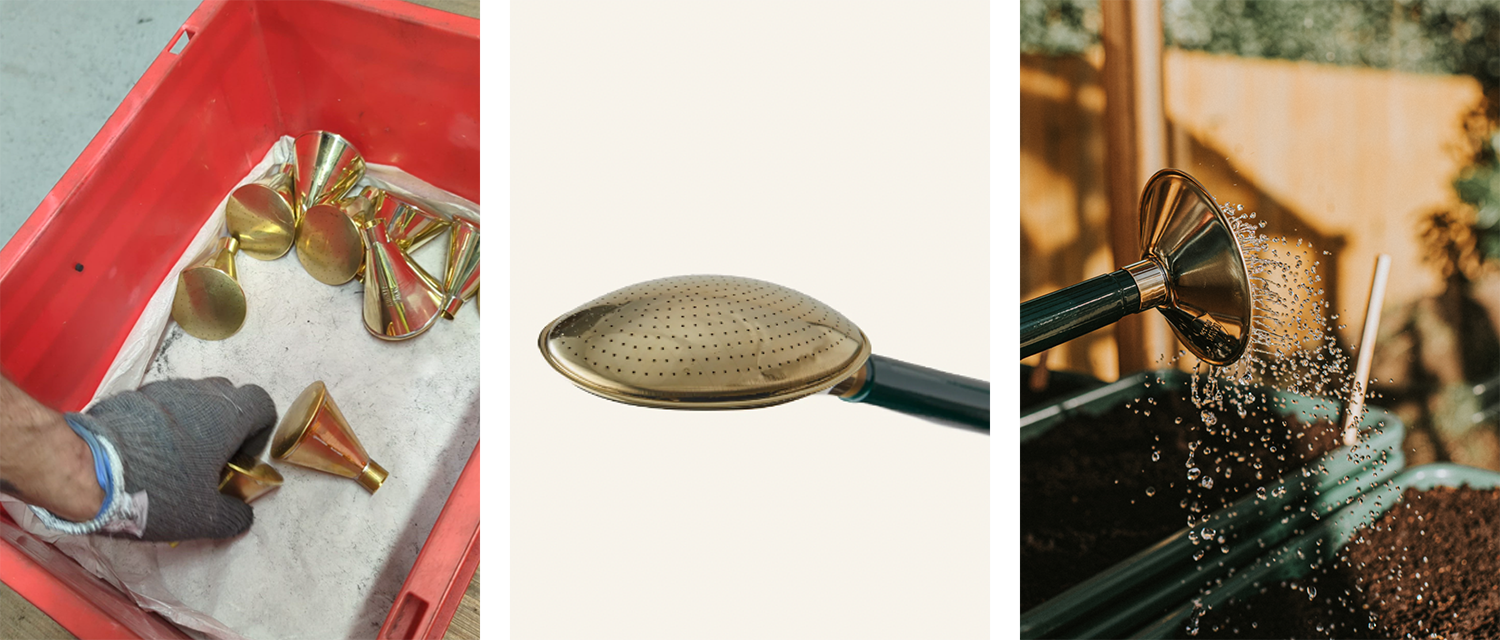 Mosazné kropítko - růže, nenápadný, ale podstatný detail většiny konví. Právě ona určuje tok vody a dává zálivce charakter blízký dešti.