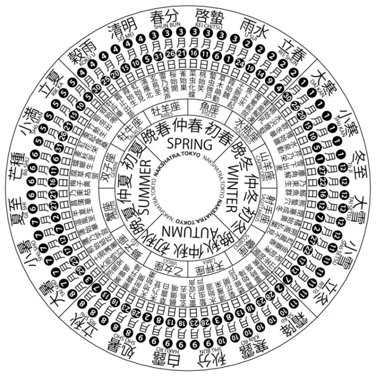 Pre lepšie pochopenie sa zahlaďte na obrázok nižšie. Koleso predstavujúce pohyb Slnka, ako ho poznáme. Na vonkajšej strane nájdete 24 sekki, každá sekki má 3 kō, bližšie k stredu je 12 znamení zverokruhu a 4 ročné obdobia.