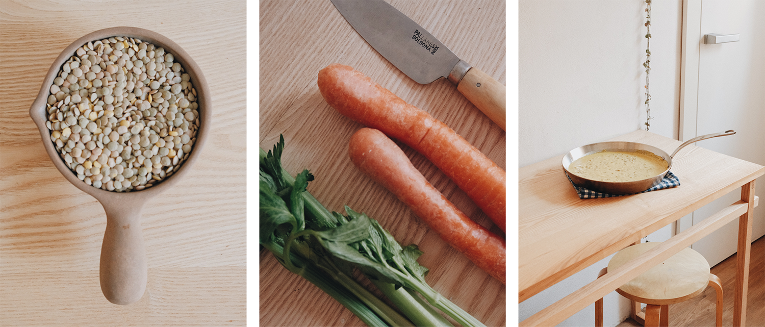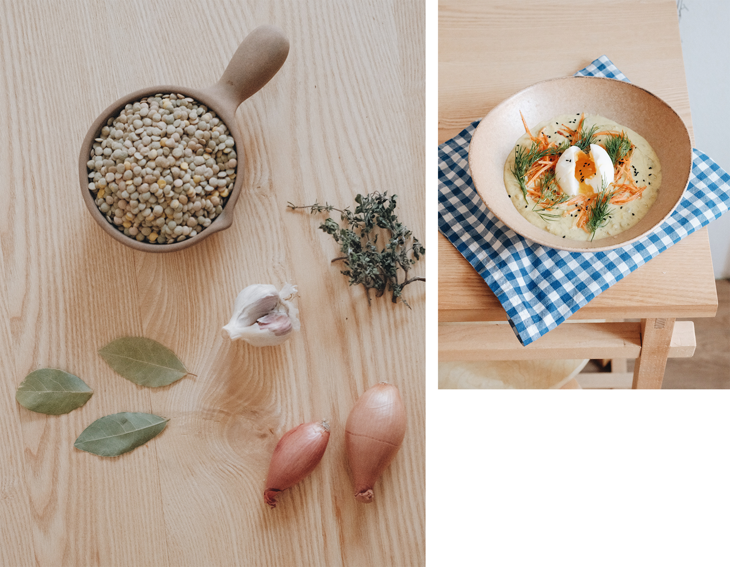 - Keď su suroviny takmer mäkké, bobkový list vyberieme a zmes rozmixujeme tyčovým mixérom. Zalejeme smotanou a pridáme zvyšok šošovice. Dovaríme. Dochutíme trochou octu, napríklad jemného ume octu.
