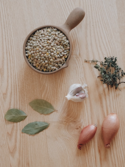 - Na začiatku si dáme variť šošovicu: v osolenej vode, s bobkovým listom bylinkami, ktoré máme po ruke (tymián,rozmarín).