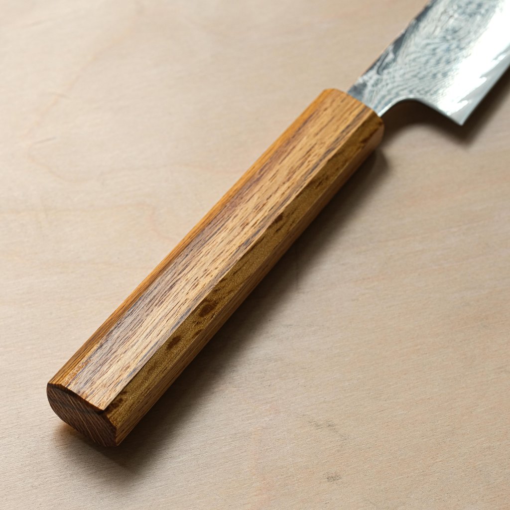 Japonský kuchyňský nůž ručně kovaný ve městě Sakai. Všestranný model Gyuto s čepelí z nerezové oceli s damaškovým...