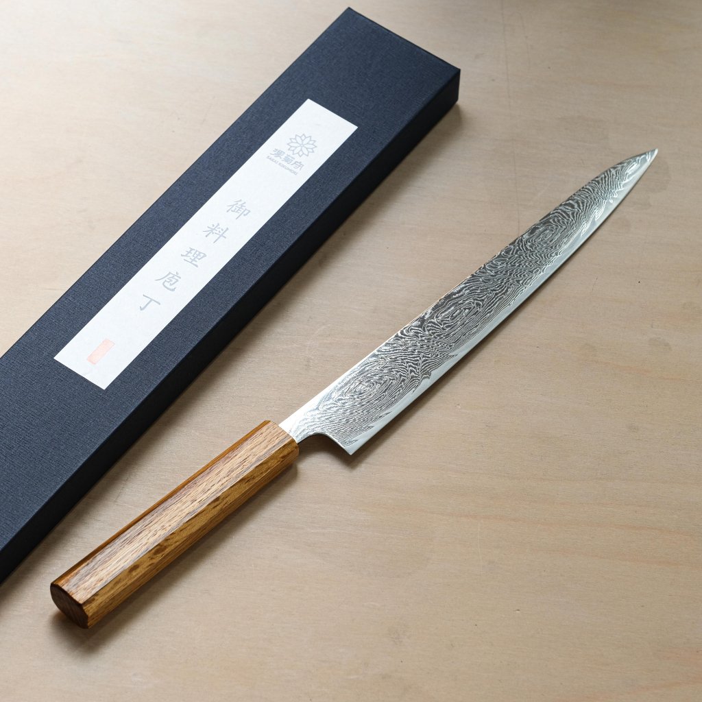 Japonský kuchyňský nůž ručně kovaný ve městě Sakai. Porcovací model Sujihiki, vynikající na krájení tenkých...